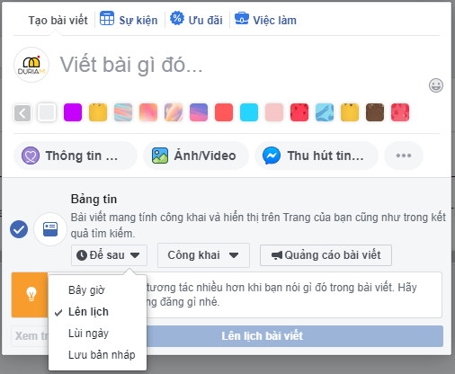 Fanpage cung cấp cho chúng ta một chức năng lên lịch đăng bài rất hữu ích. Bằng cách bấm vào Công cụ > Tạo bài viết, tại đây bạn có thể thấy tuỳ chọn Lên lịch. Với chức năng này bạn có thể lên lịch đăng bài cho 1 ngày, 1 tuần, 1 tháng thậm chí cả 1 năm miễn là bạn đã chuẩn bị sẵn nội dung.